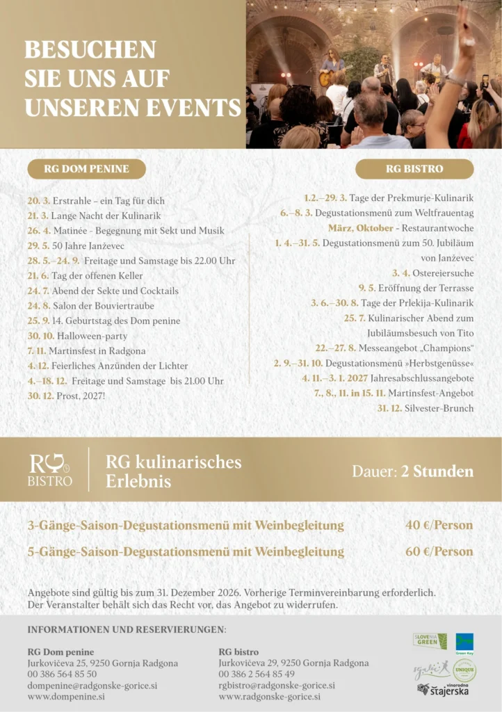 In den Radgonske gorice bereiten wir bis zum Ende des Jahres zahlreiche Veranstaltungen vor, bei denen sich erstklassige Schaumweine, ausgezeichnete Kulinarik und geselliges Beisammensein verbinden. Im RG Dom penine und im RG Bistro erwarten Sie Verkostungen, kulinarische Abende, musikalische Veranstaltungen sowie besondere saisonale Erlebnisse.